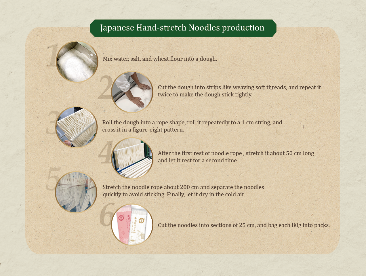 Among the four major types of noodles in Japan, hand-stretch has the most complicated manufacturing process and the most delicate texture. Hand-stretch noodles also play an important cultural role in Japan.