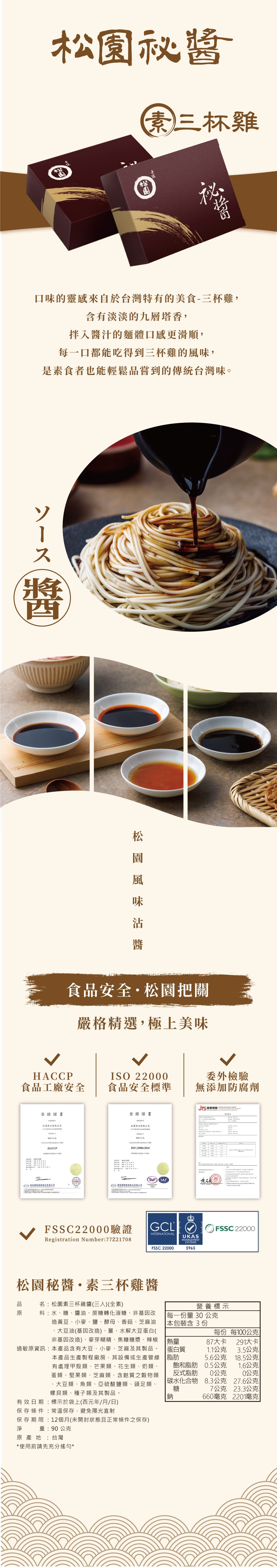 松園秘醬 - 口味的靈感來自於台灣特有的美食-三杯雞,含有淡淡的九層塔香,拌入醬汁的麵體口感更滑順,每一口都能吃得到三杯雞的風味,是素食者也能輕鬆品嘗到的傳統台灣味。
